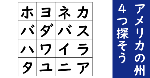 今回のテーマは「アメリカの州を4つ探そう」。答えが全て見つかったら、答え合わせをしてみましょう。