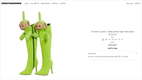 英国の子ども番組「テレタビーズ」とコラボしたブーツを、英デザイナーのクリスチャン・コーワンさんが発売しました。ビジュアルが強い……。