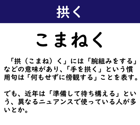 「拱(こまね)く」には「腕組みをする」などの意味があり、「手を拱く」という慣用句は「何もせずに傍観する」ことを表す。でも、近年は「準備して待ち構える」という、異なるニュアンスで使っている人が多いとか。