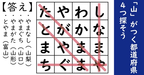 答え:やまなし(山梨)、やまぐち(山口)、やまがた(山形)、とやま(富山)