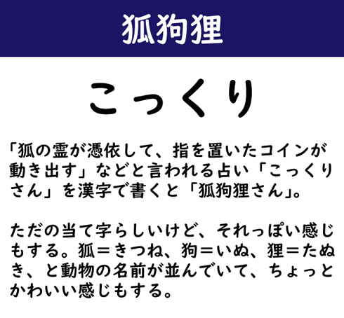 「狐の霊が憑依して、指を置いたコインが動き出す」などと言われる占い「こっくりさん」を漢字で書くと「狐狗狸さん」。ただの当て字らしいけど、それっぽい感じもする。狐=きつね、狗=いぬ、狸=たぬき、と動物の名前が並んでいて、ちょっとかわいい感じもする。