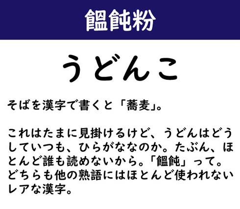 そばを漢字で書くと「蕎麦」。これはたまに見掛けるけど、うどんはどうしていつも、ひらがななのか。たぶん、ほとんど誰も読めないから。「饂飩」って。どちらも他の熟語にはほとんど使われないレアな漢字。