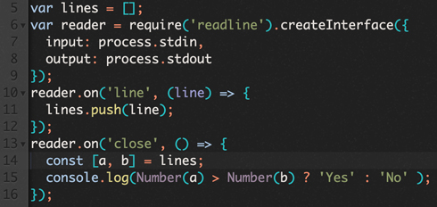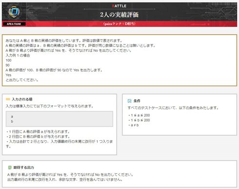 A君がB君より評価が高ければYesを、そうでなければNoを出力してください。