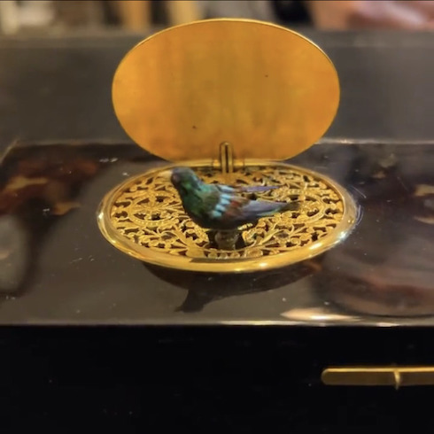 木箱に付いたスイッチを押すと上部のフタが開き、きれいな模様の鳥が登場。羽根を小刻みに羽ばたかせつつ。くるくる回りながら、その名の通り美しい声でさえずります。本物そっくりの鳴き声は、装置の中に入っている小さなふいご(送風装置)と鳥笛によって再現されているのだそうです。