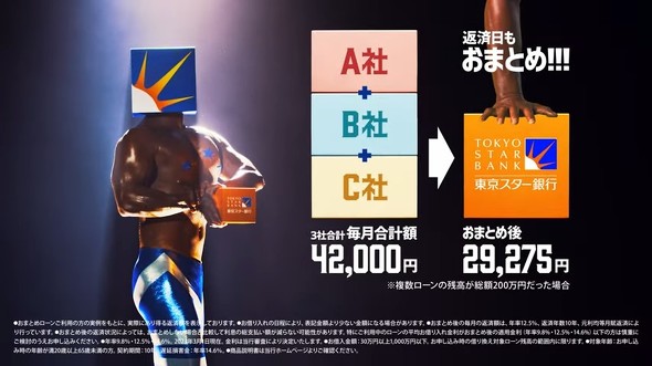 そこから「おまとめパワー」もとい東京スター銀行の「おまとめローン」の説明が始まりますが、ピッカピカに輝いている筋肉超人の肉体のほうにどうしても目が行ってしまいます。これでいいのか、東京スター銀行。