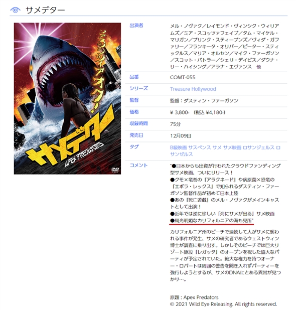 サメ映画ルーキー キャッチコピーではないですが「サメデター」ですね。「感染恐竜」と同じ監督です。この映画ほとんどサメが出ないうえに人々が無言で歩いてるシーンがほとんどなのですが、さらに露骨な尺稼ぎとして、夕日が沈むところを延々と長回しで流すだけのシーンがあります。しかも2回。というわけで、「風光明媚なカリフォルニアの海も見所」と書いておきました。