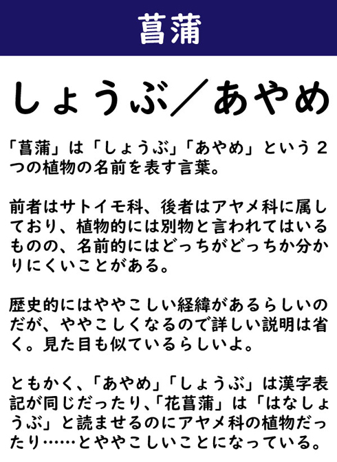 「菖蒲」は「しょうぶ」「あやめ」という2つの植物の名前を表す言葉。前者はサトイモ科、後者はアヤメ科に属しており、植物的には別物と言われてはいるものの、名前的にはどっちがどっちか分かりにくいことがある。歴史的にはややこしい経緯があるらしいのだが、ややこしくなるので詳しい説明は省く。見た目も似ているらしいよ。ともかく、「あやめ」「しょうぶ」は漢字表記が同じだったり、「花菖蒲」は「はなしょうぶ」と読ませるのにアヤメ科の植物だったり……とややこしいことになっている。