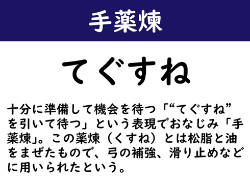 十分に準備して機会を待つ「“てぐすね”を引いて待つ」という表現でおなじみ「手薬煉」。この薬煉(くすね)とは松脂と油をまぜたもので、弓の補強、滑り止めなどに用いられたという。