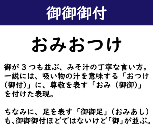 御が3つも並ぶ、みそ汁の丁寧な言い方。一説には、吸い物の汁を意味する「おつけ(御付)」に、尊敬を表す「おみ(御御)」を付けた表現。ちなみに、足を表す「御御足」(おみあし)も、御御御付ほどではないけど「御」が並ぶ。