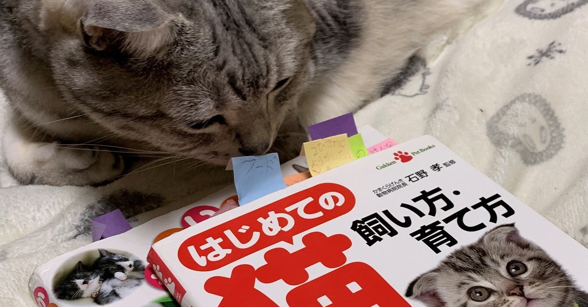 写真に写るのは、4匹の猫ちゃんが暮らす三冬さん(@mifuyu_916)さん宅の中で、一番の先輩猫「サスケ」くん(10歳)と、サスケくんをお迎えした10年前に娘さんが買いそろえた猫の飼い方の本。