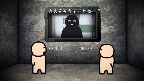 さらに部屋に設置されたモニターが点いて、黒幕であるデスゲームの主催者も登場。通常であればここで淡々とデスゲームの残虐なルール説明が行われる場面ですが、彼もまさかの人見知り。「あっあっ、これ、うつ、映ってますか…?」「あっ、スイマセン何かあの……」と謎の腰の低さです。これに対しデスゲーム参加者も「いやいやいやいや」と相手をおもんばかるため、もはや誰が誰をもてなしているかも分からない状況に。