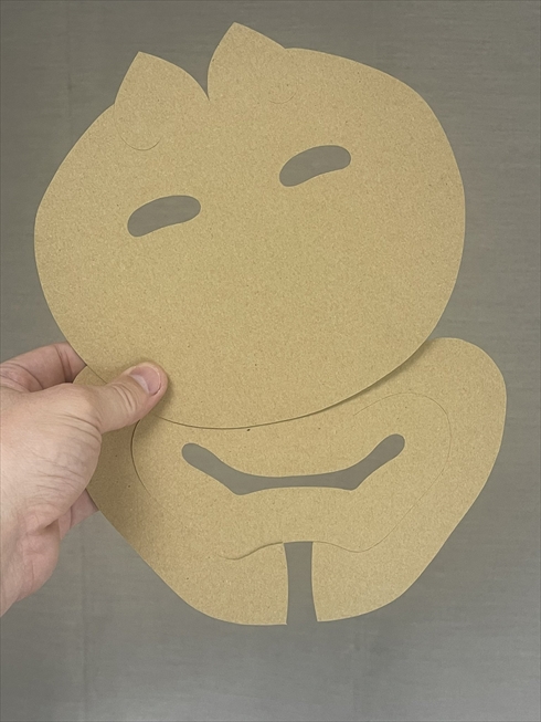 Twitterでは「般若の面」の完成品だけでなく、作り始める初手の写真も披露。切り出された2枚のダンボールの型紙からは、完成するまでのプロセスがまるで見えてきません。