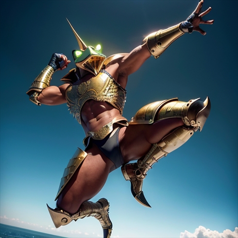 「井の中の蛙、大海を知らず」ということわざをテーマに生成されたイラストには、「カエル」のマスクにメカメカしいスーツで身を包んだ謎のヒーローが描かれています。