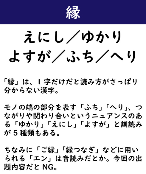 「縁」は、1字だけだと読み方がさっぱり分からない漢字。モノの端の部分を表す「ふち」「へり」、つながりや関わり合いというニュアンスのある「ゆかり」「えにし」「よすが」と訓読みが5種類もある。ちなみに「ご縁」「縁つなぎ」などに用いられる「エン」は音読みだとか。今回の出題内容だとNG。