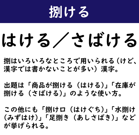 捌はいろいろなところで用いられる(けど、漢字では書かないことが多い)漢字。出題は「商品が捌ける(はける)」「在庫が捌ける(さばける)」のような使い方。この他にも「捌け口(はけぐち)」「水捌け(みずはけ)」「足捌き(あしさばき)」などが挙げられる。