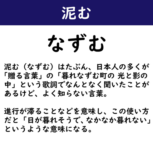 泥む(なずむ)はたぶん、日本人の多くが「贈る言葉」の「暮れなずむ町の 光と影の中」という歌詞でなんとなく聞いたことがあるけど、よく知らない言葉。進行が滞ることなどを意味し、この使い方だと「日が暮れそうで、なかなか暮れない」というような意味になる。
