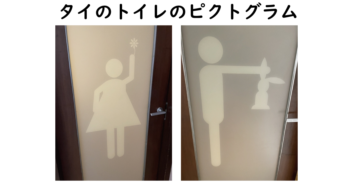女性トイレは花を掲げているので「お花摘み」にも見えますが、男性トイレはどうみてもウサギの耳をつかんでいるようにしか見えません。これはタイのスラングをデザインに落とし込んだもので、女性が小用を足す場合は日本と同じく「花を摘みに行く」と言いますが、男性が小用を足す場合は「ウサギを撃ちに行く」と言うことから、このデザインが選ばれたようです。