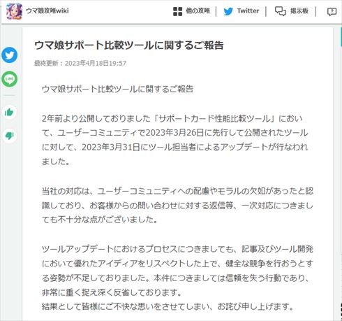 GameWithは4月18日、同社の提供する「ウマ娘」攻略ツールが、ファン運営の攻略ツールと酷似していると指摘されていた問題で、「ユーザーコミュニティへの配慮やモラルの欠如があった」として謝罪しました