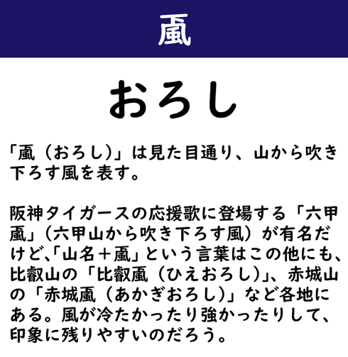 「颪(おろし)」は見た目通り、山から吹き下ろす風を表す。阪神タイガースの応援歌に登場する「六甲颪」(六甲山から吹き下ろす風)が有名だけど、「山名+颪」という言葉はこの他にも、比叡山の「比叡颪(ひえおろし)」、赤城山の「赤城颪(あかぎおろし)」など各地にある。風が冷たかったり強かったりして、印象に残りやすいのだろう。