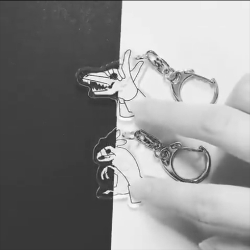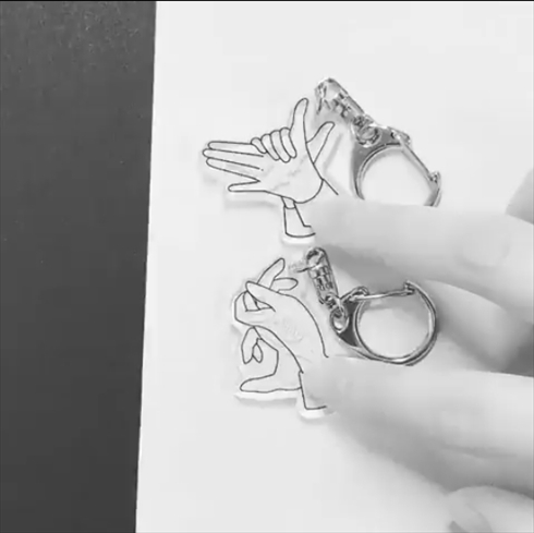 話題になっているのは、デザイナーのruff(@crow_pierrot)さんが製作した、遊び心あるキーホルダーの動画です。動画に映されているのは、イヌとウサギの姿を手で表現した「手遊び」のイラストが描かれたキーホルダーが、白い紙の上に置かれている様子。
