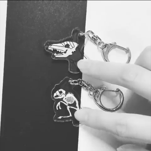 しかし、実はキーホルダーにはそれ以外にも模様が描かれており、2つのキーホルダーを少しずつ紙の外に滑らせていくと、なんとイヌとウサギの真っ白な骨格が出現する仕組みだったのです。「骨になる手」ってそういう意味か!