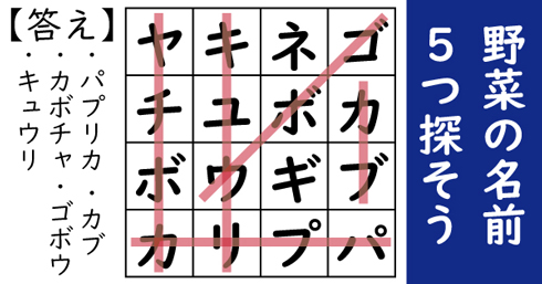 答え:パプリカ、カボチャ、キュウリ、カブ、ゴボウ
