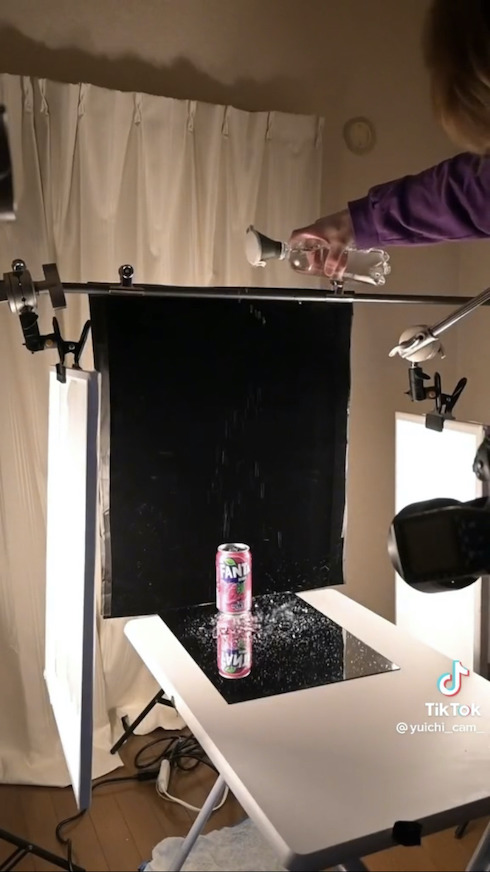 今回、フォロワーからのリクエストに応えて、ゆーいちさんがチャレンジしたのがファンタの写真。ライトや一眼レフカメラ、背景には黒い紙を設置し、ファンタの上からボトルでシャワーのように水をかけて撮影していきます。