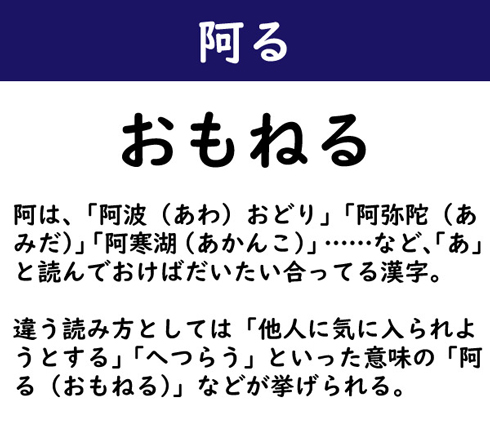 阿は、「阿波(あわ)おどり」「阿弥陀(あみだ)」「阿寒湖(あかんこ)」……など、「あ」と読んでおけばだいたい合ってる漢字。違う読み方としては「他人に気に入られようとする」「へつらう」といった意味の「阿る(おもねる)」などが挙げられる。