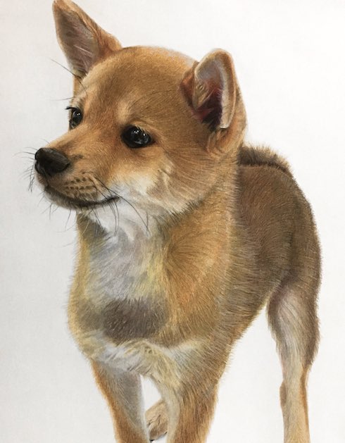 作者はイラストレーターの慧人(@Yassun0222K)さん。一見すると豆柴を写した写真のように見えてしまいますが、なんと色鉛筆で描かれているとのこと。黒々としたつぶらな瞳や触り心地の良さそうな毛並みは、まるで命が宿っているかのようです。今にも動き出しそうな生き生きとした質感に引き込まれます。