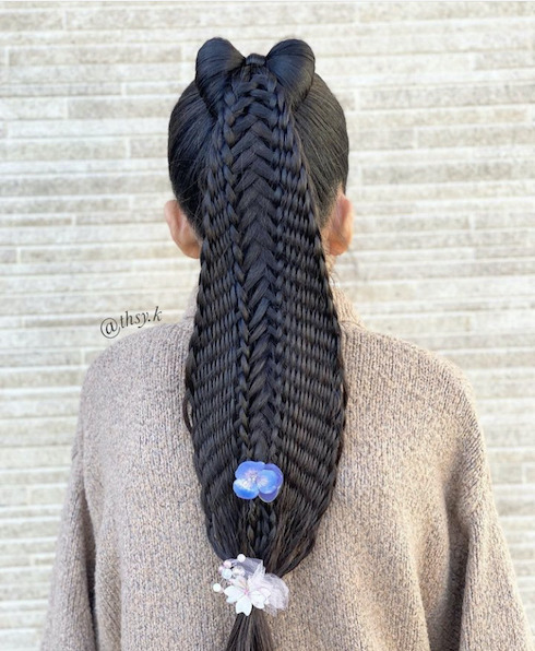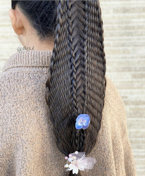 注目を集めているのは、kaori.k(@thsy.k)さんが、10歳の娘さんに施したヘアアレンジを紹介する写真です。長い黒髪を丹念に編み込んで、繊細できめ細やかな織物のように仕上げました。単におしゃれなだけではない、1つのアート作品といえる美しさです。