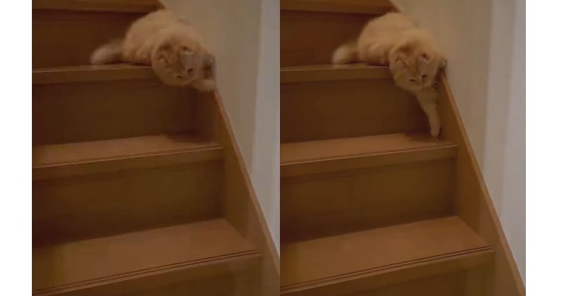 液体化した猫ちゃん、階段の降り方のクセが強すぎる! ぬるんとすべる姿に「二日酔いですかw」「可愛すぎます」