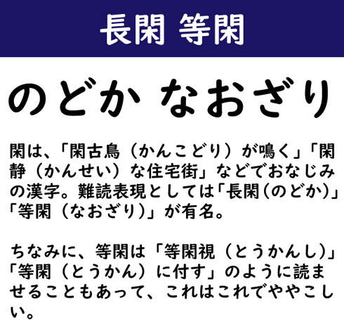 閑は、「閑古鳥(かんこどり)が鳴く」「閑静(かんせい)な住宅街」などでおなじみの漢字。難読表現としては「長閑(のどか)」「等閑(なおざり)」が有名。ちなみに、等閑は「等閑視(とうかんし)」「等閑(とうかん)に付す」のように読ませることもあって、これはこれでややこしい。