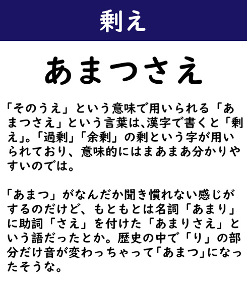 「そのうえ」という意味で用いられる「あまつさえ」という言葉は、漢字で書くと「剰え」。「過剰」「余剰」の剰という字が用いられており、意味的にはまあまあ分かりやすいのでは。「あまつ」がなんだか聞き慣れない感じがするのだけど、もともとは名詞「あまり」に助詞「さえ」を付けた「あまりさえ」という語だったとか。歴史の中で「り」の部分だけ音が変わっちゃって「あまつ」になったそうな。