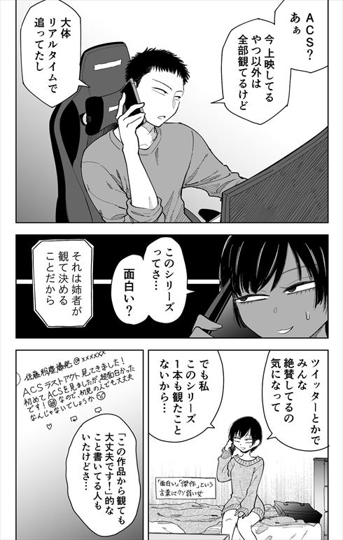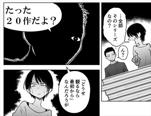 覚悟を決めて見始めた女性は、どんどん作品にはまっていきます。寝る間を惜しんで20作を視聴し、ついに劇場へ。はたして完結作を見た女性は――。