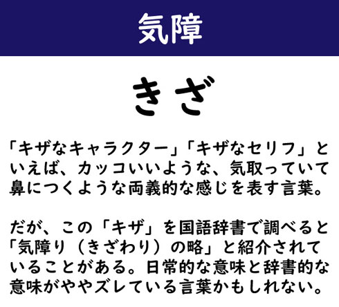 「キザなキャラクター」「キザなセリフ」といえば、カッコいいような、気取っていて鼻につくような両義的な感じを表す言葉。だがこの「キザ」を国語辞書で調べると、「気障り(きざわり)の略」と紹介されていることがある。日常的な意味と辞書的な意味がややズレている言葉かもしれない。