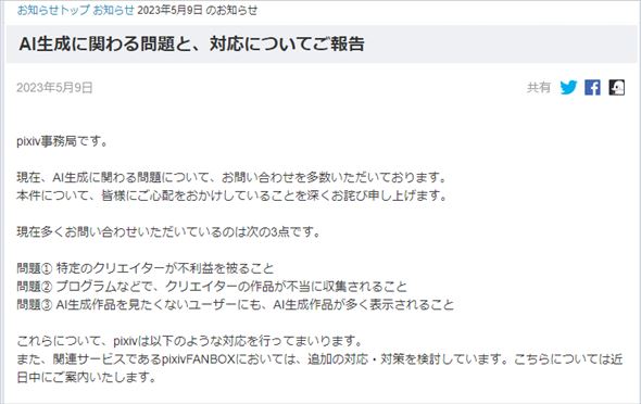 pixivの「AI生成に関わる問題と、対応についてご報告」