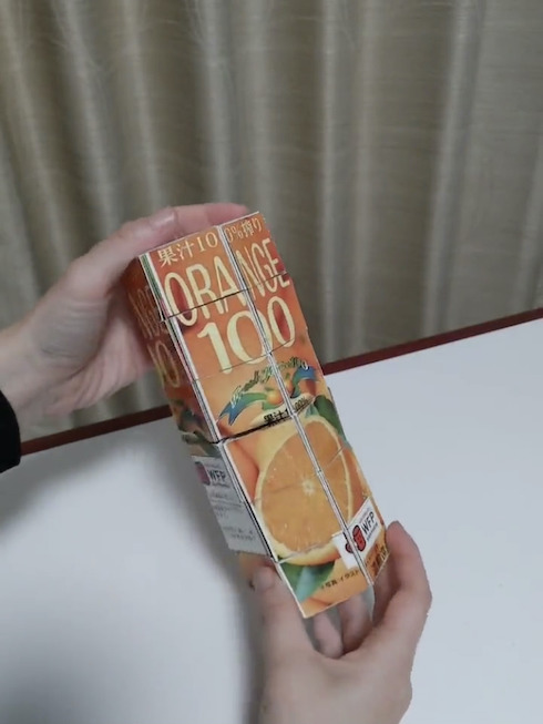 どうなってるの!? オレンジジュースのパックがりんごジュースにトランスフォームする工作の動画が、Twitterで1.7万件以上の“いいね”を獲得しています。