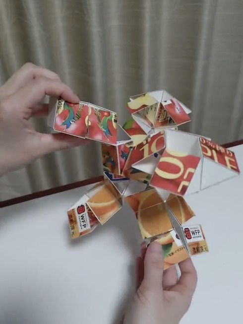 この作品のもととなったのは、2021年にTwitterに投稿された3D動画。その動画を参考にすると、オレンジジュースのパックの内側に貼られたりんごジュースのパックが、変形させることで表面に現れていたことが分かります。見るからに複雑そうな機構ですが、それを実際の工作物として再現する技術がすごい!