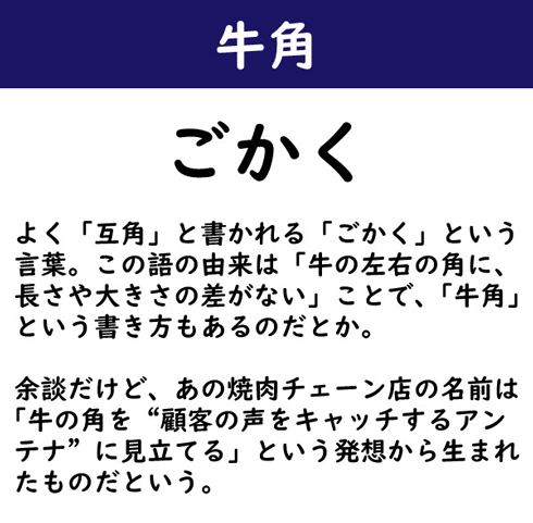 よく「互角」と書かれる「ごかく」という言葉。この語の由来は「牛の左右の角に、長さや大きさの差がない」ことで、「牛角」という書き方もあるのだとか。余談だけど、あの焼肉チェーン店の名前は「牛の角を“顧客の声をキャッチするアンテナ”に見立てる」という発想から生まれたものだという。