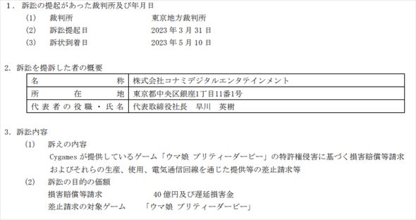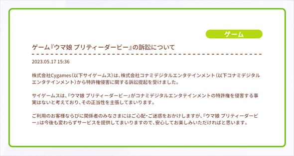 Cygamesの運営するゲームアプリ「ウマ娘 プリティーダービー」に対し、コナミデジタルエンタテインメントが特許権侵害訴訟を起こしました。Cygamesの親会社であるサイバーエージェントが発表しました。