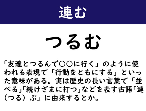 「友達とつるんで○○に行く」のように使われる表現で「行動をともにする」といった意味がある。実は歴史の長い言葉で「並べる」「続けざまに打つ」などを表す古語「連(つる)ぶ」に由来するとか。