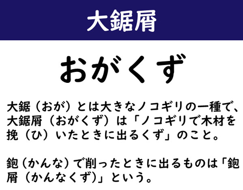 大鋸(おが)とは大きなノコギリの一種で、大鋸屑(おがくず)は「ノコギリで木材を挽(ひ)いたときに出るくず」のこと。鉋(かんな)で削ったときに出るものは「鉋屑(かんなくず)」という。