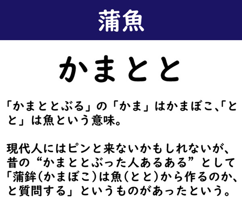 「かまととぶる」の「かま」はかまぼこ、「とと」は魚という意味。現代人にはピンと来ないかもしれないが、昔の“かまととぶった人あるある”として「蒲鉾(かまぼこ)は魚(とと)から作るのか、と質問する」というものがあったという。