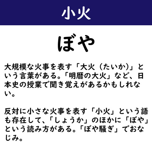 大規模な火事を表す「大火(たいか)」という言葉がある。「明暦の大火」など、日本史の授業で聞き覚えがあるかもしれない。反対に小さな火事を表す「小火」という語も存在して、「しょうか」のほかに「ぼや」という読み方がある。「ぼや騒ぎ」でおなじみ。