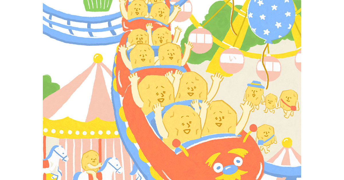 遊園地でジェットコースターを楽しむ「ジャガイモ」の皆さん。すごいスピードだから、ちょっと怖いけどテンション上がりますね! さてさて、このじゃがいもだらけのイラストの中に「いちご」が隠されています。どこか分かりますか? 隠し絵クイズに挑戦してみてください。