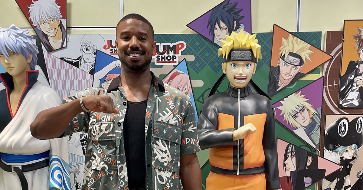 「JUMP SHOP」店内でナルトの立像を前に記念撮影したマイケル・B・ジョーダン