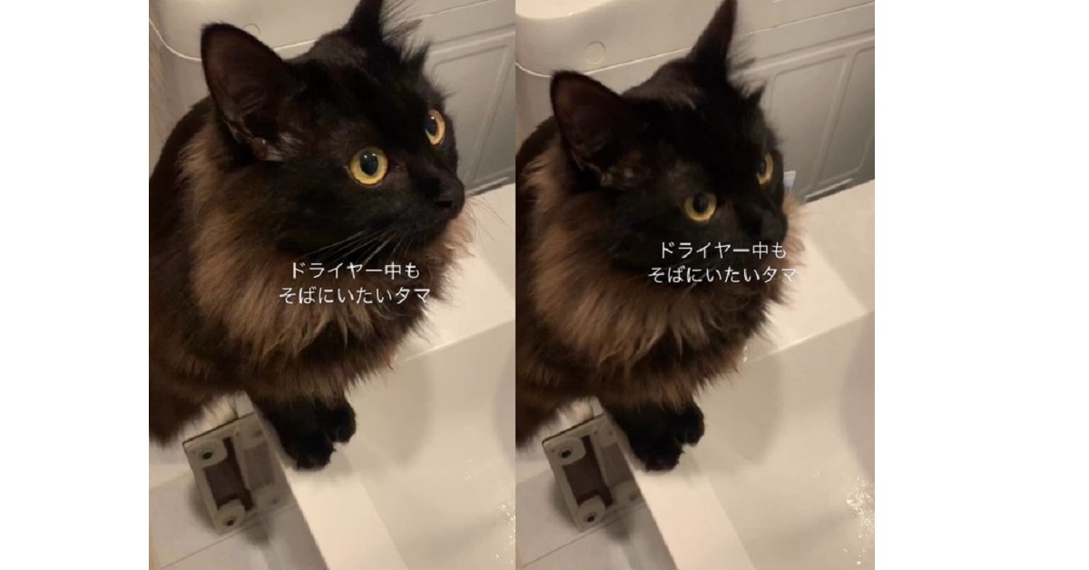 話題になっているのは元保護猫の「タマ」ちゃん、とっても甘えん坊な女の子です。タマちゃんは飼い主さんの事が大好きで、どんなときでもそばにいたいタイプ。飼い主さんがドライヤーで髪を乾かしているときも離れたくありません。