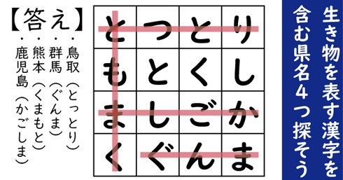 答え:鳥取(とっとり)、群馬(ぐんま)、熊本(くまもと)、鹿児島(かごしま)