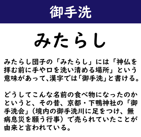 みたらし団子の「みたらし」には「神仏を拝む前に手や口を洗い清める場所」という意味があって、漢字では「御手洗」と書ける。どうしてこんな名前の食べ物になったのかというと、その昔、京都・下鴨神社の「御手洗会」(境内の御手洗川に足をつけ、無病息災を願う行事)で売られていたことが由来と言われている。