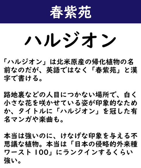 「ハルジオン」は北米原産の帰化植物の名前なのだが、英語ではなく「春紫苑」と漢字で書ける。路地裏などの人目につかない場所で、白く小さな花を咲かせている姿が印象的なためか、タイトルに「ハルジオン」を冠した有名マンガや楽曲も。本当は強いのに、けなげな印象を与える不思議な植物。本当は「日本の侵略的外来種ワースト100」にランクインするくらい強い。